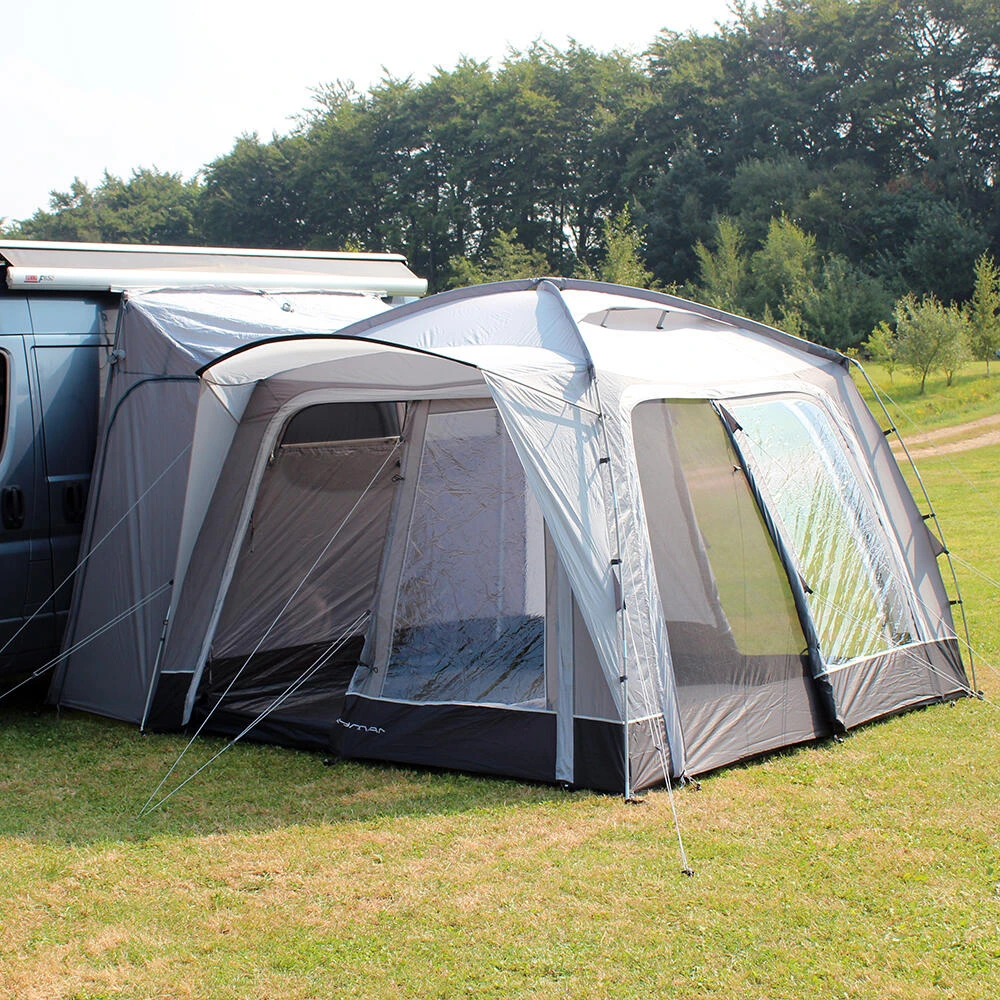 This lightweight pole and sleeve drive-away awning remains the most popular, upper entry-level small family weekender on the market. With just two fibreglass poles used to create the main body of the awning it is quick and easy to pitch, and structurally very stable. The unique design means this is one of the most versatile driveaways on the market, offering access from all sides of the awning through the large roll back doors. Has the option to zip a Cayman Bedroom Annex to the back of the awning, meaning your main living space is not affected if you are looking to add sleeping space. Available in Three ergonomic cowl heights to suit the vast majority of campervans & motorhomes, the Cayman F/G offers unrivalled value for money. Including a ‘fold-flat’ sewn-in groundsheet, and lots of ventilation with plenty of mesh fly screen panels, this is the awning of choice for smaller touring families, couples or independent adventurers, who crave more usable space alongside their van, to meet a budget. Fixing Height 255cm – 305cm (High). • 120HDE high density all-weather lightweight fabric